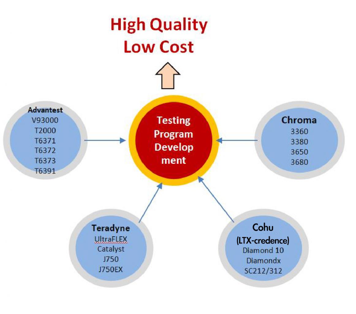 EE Solutions provides test planning and strategies for digital, analog and memory blocks and work with customers to select the right test platforms to optimize costs. Our engineers have extensive experience with top tier testing firms in Taiwan. We design load boards and probe cards and provide test program development for all major platforms (Advantest, Teradyne, Cohu (LTX-credence) and Chorma). We have proprietary test pattern conversion tools support all the major platforms. EE Solutions experienced engineers determine the most cost effective production tester based on the required pin count, speed, and nature of the design. All our testing partners are located in Taiwan and have relationships with vendors like ASE、SPIL、KYEC、Chipbond、 PAT、GT 、 YTEC, makes it efficient to resolve issues.